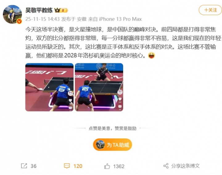 赛后,前国乒教练吴敬平谈到了本场比赛。吴敬平写道:今天这场半决赛,是火星撞地球,是中国队的巅峰对决。前四局都是打得非常焦灼,双方的比分都抠得非常细,每一分球都赢得非常不容易,这是我们现在的年轻运动员所缺乏的。其次,这比赛是正手体系和反手体系的对决。这场比赛不管输赢,他们都将是2028年洛杉矶奥运会的绝对核心。